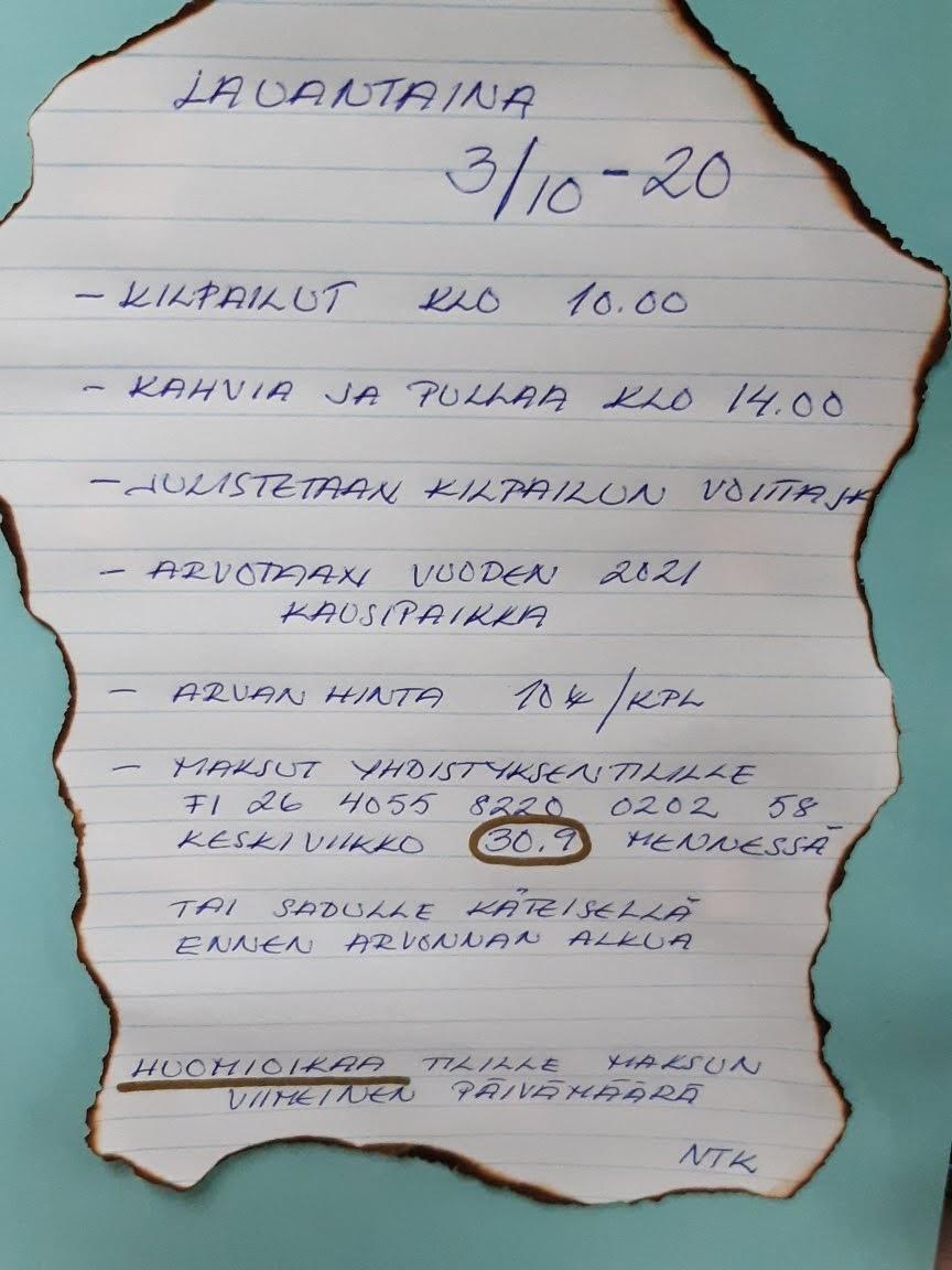Kausipaikka vuodelle 2023 arvotaan päättäjäisten yhteydessä. Jos haluat osallistua arpajaisiin, maksa arvan hinta 10€ yhdistyksen tilille viimeistään tiistaina 27.9.2022.